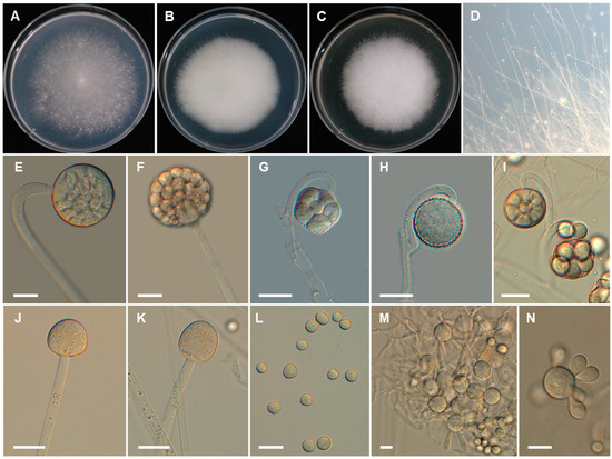 Morphology of Backusella koreana. (A), Colony on SMA. (B), Colony on PDA. (C), Colony on MEA. (D), Sporangiophores forming sporangia. (E,F), Sporangia. (G), Multi-spored sporangiolum. (H), Uni-spored sporangiolum. (I), Multi-spored sporangiola borne on circinate branches. (J,K), Columellae of different shapes. (L), Sporangiospores. (M,N), Yeast-like cells. Scale bars = 20 μm.
