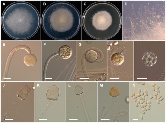 Morphology of Backusella thermophila. (A), Colony on SMA. (B), Colony on PDA. (C), Colony on MEA. (D), Sporangiophores forming sporangia. (E–H), Young and mature sporangia. (I), Multi-spored sporangiolum. (J–M), Columellae of various shapes. (N), Sporangiospores. Scale bars = 20 μm.