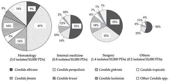 Sakamoto, Y.; Kawabe, K.; Suzuki, T.; Sano, K.; Ide, K.; Nishigaki, T.; Enoki, Y.; Taguchi, K.; Koike, H.; Kato, H.; et al. Species Distribution of Candidemia and Their Susceptibility in a Single Japanese University Hospital: Prior Micafungin Use Affects the Appearance of Candida parapsilosis and Elevation of Micafungin MICs in Non-parapsilosis Candida Species. J. Fungi 2021, 7, 596. https://doi.org/10.3390/jof7080596