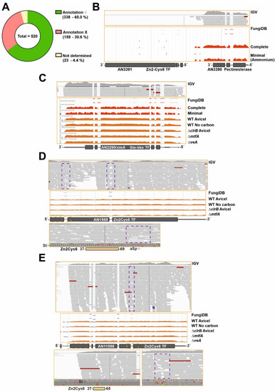 In general, comparative analyses among species are conducted based on genome annotations. However, the reliability of eukaryotic genome annotations is considered low, due in part to the low percentage of eukaryotic genomes comprising protein-coding exons and that gene coding regions are interrupted by introns [53]. Thus, it was of interest what percentage of the potential A. nidulans TFome is transcribed as predicted, and if there was a subset of genes rendering TF forms different from the predicted full length forms or even non-functional. With this aim, RNA-seq experiments published by us previously [29,30,31] and transcriptomic data available in the FungiDB database were used as a reference to compare genomic annotations and the most probable transcript sequences (Figure 2).