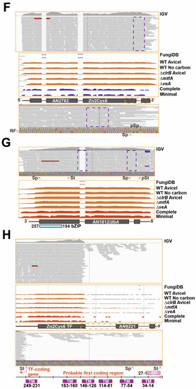 Genes/transcripts needing some type of re-annotation were included in a third group (approximately 159 out of 520; 30.6%; Figure 2A). Of them, 124 were predicted to code for Zn2Cys6 and/or Fungal sp. IPDs, 17 for C2H2, 5 for bHLH, 3 for bZIP, 3 for homeodomain, 1 for a myb-like, 2 for GATA-type, 1 for Copper Fist, 1 for WOPR, 1 for Velvet and 1 for Forkhead domain IPDs. In multiple cases, the discrepancy between annotation and transcriptomic data was limited to the 5′- or 3′-end of the gene. This can be seen in the cases of An11098, encoding a Zn2Cys6-type TF, in which the start codon is probably located in the beginning of the predicted second exon (M23) (Figure 2E); and AN2782, also coding for a binuclear zinc cluster, in which the third predicted intron is absent (dotted purple square), modifying the reading frame and the stop signal (Figure 2F). Transcriptomic data also suggested that the coding sequences of a subset of genes within this third group clearly differ from the predicted ones. Three examples are shown in Figure 2. The start of the AN1812/jlbA transcript, which is upregulated under nitrogen starvation [55], is as annotated. However, the predicted first intron is absent and the 5′-UTR region of AN1812/jlbA is probably longer than predicted (Figure 2G). The probable start codon of the coding sequence will be that for Met175, with the bZIP domain predictably extending from residues 194 to 257 (the predicted polypeptide in FungiDB and AspGD databases is 258 amino acids long). AN9221 is predicted to code for a TF with a signal peptide (SP) and six transmembrane (TM) domains in the N-terminus of the protein (first 249 amino acids), and a Zn2Cys6 IPD between residues 267 and 303 (Figure 2H). The number of reads mapping to the first two predicted exons and introns is very low compared to those mapping to the predicted third exon. RNA-seq reads also suggest that there is no intron in the sequence, and that AN9221 is two separate genes, alnG and alnR of the asperlin cluster, as proposed by Grau and colleagues [56] (bottom panel in Figure 2H). The probable start codon of alnR is that which is annotated in the FungiDB database as Met246 for AN9221, just before the region coding for the binuclear zinc cluster domain. Finally, the analysis of An5252 is shown in Figure 2I. Firstly, the predicted protein sequence of AN5252 is identical to that of AN9240, suggesting that they are not paralogs but rather correspond to a genome assembly/annotation error. Despite the low number of reads mapping to this gene (Figure 2I), RNA-seq data suggest that the gene contains only one intron (the predicted second intron). The 5′-UTR region is probably longer than predicted, and the real start codon possibly corresponds to that annotated as M117, implying the loss of the first predicted C2H2 domain (dark grey square bolded in red). The predicted second C2H2 IPD (M127-D168 plus 20 codons out of frame; coordinates of the FungiDB version) would be included in the coding region of AN5252.