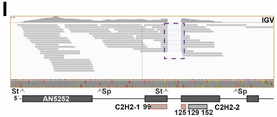 The information of RNA-seq analysis for each predicted TF-coding gene is included in Table S5 (column B: RNA-seq data). It was not possible to assess the annotation of approximately 23 genes (out of 520; 4.4%; Figure 2A and Table S5; the expression levels of AN3391, encoding a Zn2Cys6-type TF, are shown in Figure 2B as an example of this first group). The coding sequences of approximately 338 genes/transcripts are processed as predicted (65.0%; Figure 2A) in the culture conditions and genetic backgrounds analyzed (coverage of RNA-seq reads at the AN2290/steA locus, coding for a regulator of sexual development [54], is shown as an example in Figure 2C). In some cases, alternative splicing events were identified in transcripts, but the corresponding genes were included in this second group because the position and extension of the introns were correctly annotated. Intron retention (IR) was a commonly found alternative splicing form. The expression levels of AN1569, encoding a Zn2Cys6 TF, are shown as an example in Figure 2D. Retention of the first intronic (dotted purple squares) sequence leads to a premature stop codon that would generate a truncated peptide containing only the Zn2Cys6 IPD (amplification of the dotted orange square in the bottom panel of Figure 2D). Considering the low number of reads showing the processing of that first intron, it can be suggested that the concentration of the full length form of the protein will be, in all probability, very low.