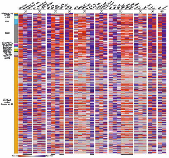 To analyze the expression patterns of the genes encoding the potential TFome of A. nidulans, we retrieved RNA-seq data from multiple transcriptomic comparisons carried out using A. nidulans as the reference system and publicly available in the FungiDB database or other repositories (see Materials and Methods). Table S6 includes FPKM and TPM data for each TF-coding transcript, which are ordered according to the IPD family that the corresponding protein belongs to (dual specificity TFs, those containing more than one type of IPD [50], were included in all the families they belong to, and, thus, repeated). First, heatmaps were built for each comparison. Clustering was avoided to check if there could be any expression pattern associated with a specific IPD family. Figure S1 shows that it is not the case.