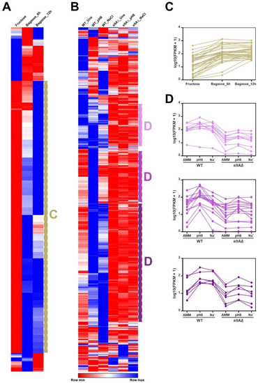 Figure 3 and Figure S1 also suggest that specific culture conditions and genetic backgrounds trigger a change in the general expression pattern of the A. nidulans TFome (see black bars in Figure 3 and Figure S1). The clustering of heatmaps corresponding to the effect of the addition of sugarcane bagasse as the main nutrient source (Figure 4A,C) [35], or a null sltA (salt sensitivity) background (Figure 4B,D) [29], supports this possibility. Qualitatively, a majority of TF-coding genes seem to be upregulated in the first culture conditions, but downregulated in the sltAΔ mutant.
