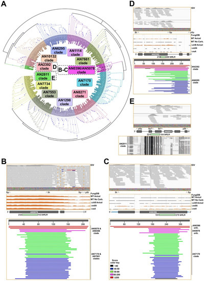 The phylogenetic tree in Figure 5A included AN0396 in the AN5078 clade. RNA-seq data showed that the predicted intron of AN0396 is processed, and the predicted protein sequence is in all probability correct (Figure 5C). BLAST and HMMER searches, as well as confirmatory reverse retrievals, showed conservation of AN0396 exclusively in A. mulundensis, with the rest of hits being apparently orthologs of AN5078 first, and AN7170 in the second instance. These results strongly suggest that AN0396 corresponds to an even more recent duplication of AN5078.