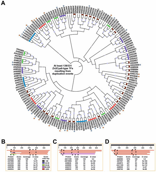 Duplication events within the zinc cluster family of TFs in A. nidulans. (A) Phylogenetic tree generated with Mega, version 7.0.26 (neighbor-joining method and 5,000 bootstrap replications), and edited using iTOL, showing the paralog clusters predicted by the CD-Hit suite. Predicted paralog clusters of 2, 3, 4, 5 and 6 members are highlighted with brown, green, purple, red and blue lines, respectively. Some Zn2Cys6-type TFs excluded from these paralog clusters (clusters of 1 member in the CD-Hit suite) were also included. Gray circles indicate those TFs predictably involved or shown to be involved in the control of secondary metabolism, while stars indicate TFs having a standard name. Bootstrap values are indicated by light purple circles. (B-D) BLAST alignments (NCBI website) for each of the three paralog clusters of six members identified by CD-Hit, using as queries AN3385 (B), AN11169 (C) and AN8590 (D), respectively. Score, expect and coverage values are included. The score color key is shown in panel B. The extension of Zn2Cys6 and fungal specific regulatory domains is shown in each panel with the black squares. The alignments of the sequences in each panel (B–D) can be seen in Figures S2–S4, respectively.