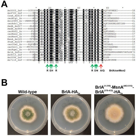In an attempt to obtain clues on the origin and the ancestor(s) of BrlA, I compared the C2H2 IPDs of BrlA with those of specific Aspergillus nidulans and Saccharomyces cerevisiae TFs of the same family (Figure 7A). The sequences aligned in Figure 7A conserved all but one of the residues of S. cerevisiae Msn paralogs (cerMsn2 and cerMsn4), predicted to contact DNA (green and red arrows, respectively) [68]. The only divergence was the substitution of a Gln in the second C2H2 IPD of Msn proteins, and SteA by an Ala in BrlA. Thus, it is tempting to suggest that the C2H2-type transcriptional regulatory region of the asexual developmental regulator BrlA belongs to the same family of those of MsnA and SteA, which are regulators of stress-response and sexual development, respectively. However, as expected, the C2H2 domains of MsnA (residues T463-H515) could not functionally replace those of BrlA (residues F320-H375), as a recombinant strain expressing a BrlA::HA3x chimera bearing this replacement (M1-Q319 of BrlA, T463-H515 of MsnA, and S376-E432 of BrlA) showed an aconidial phenotype (Figure 7B).