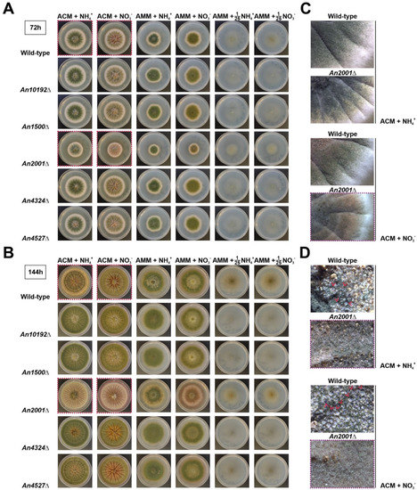 Multiple criteria were defined for the selection of these five genes. First, orthologs of genes that in other fungi, such as Neurospora crassa, are important for development were included (e.g., according to the FungiDB database, An10192 is the ortholog of N. crassa tah-2). Second, genes significantly deregulated after the induction of asexual development were included (AN1500 and AN4324, respectively) [30]. Third, genes with one (AN10192) or no paralogs (AN1500, AN2001, AN4324 and AN4527) were prioritized. Finally, genes coding for TFs of the most numerous families were selected (AN10192 and AN2001 encode zinc clusters, AN1500 encodes a C2H2-type TF, AN4324 encodes a bZIP-type TF, and AN4527 encodes a cMyb-type TF). In comparison with the parental wild-type and the remaining null mutant strains generated, the AN2001Δ mutant showed partial inhibition of radial growth and conidia production, mainly in ACM (Aspergillus complete medium) supplemented with nitrate as the main nitrogen source (Figure 8A,C). After 144 h of culture at 37 °C, while the reference wild-type strain produced cleistothecia in ACM (Figure 8B,D), the AN2001Δ mutant was blocked for the development of sexual structures.