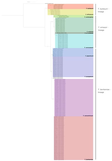 The phylogenetic tree constructed based on the concatenated ITS+BT multiple sequence alignment divides the complex into three major lineages within the T. benhamiae-complex, namely T. benhamiae-, T. erinacei-, and T. bullosum-lineages (Figure 1). The monophyly of the species T. erinacei, T. eriotrephon, T. verrucosum, T. bullosum, T. africanum, and T. concentricum is strongly supported.