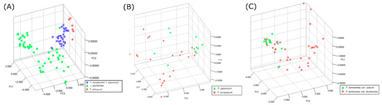 Principal component analysis (PCA) 3D visualization of the three first components made in MassUp. (A) Using the strains traditionally designated T. benhamiae (T. africanum, T. europaeum, T. japonicum, T. benhamiae); (B) using strains designated T. europaeum and T. japonicum based on ITS genotype; (C) using strains designated T. benhamiae var. benhamiae and T. benhamiae var. luteum based on morphology.