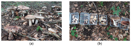Amanita rubescens Pers: (a) Sampling place with different fruiting body developmental stages; (b) collected samples of six developmental stages in PE boxes.