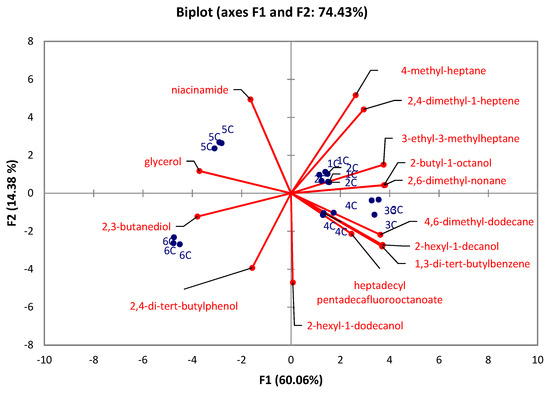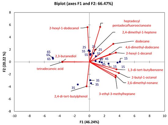 There were significant differences (Kruskal-Wallis test) observed in the caps between the developmental stages in all identified compounds (p < 0.05) except for 7-methyl-6-tridecene (p = 0.1176), and 5-ethyl-5-methyl-decane (p = 0.1176). At the same time, there were no significant differences in stipes between the developmental stages in 1-tetradecene (p = 0.1215), 2,5-dimethyl-2,5-hexanediol (p = 0.0568), 2,6,10-trimethyltridecane (p = 0.6627), 3,7,11,15-tetramethyl-2-hexadecene (p = 0.0639), 1-iodo-dodecane (p = 0.1176), tetradecyl pentadecafluorooctanoate (p = 0.1176), pentadecane (p = 0.1489), 3,8-dimethyl-undecane (p = 0.0793), 4,6-dimethyl-undecane (p = 0.2261), and 4,8-dimethyl-undecane (p = 0.0759). The PCA for caps (Figure 3) revealed that 74.43% of the total variation embodied in 14 variables could be effectively condensed and explained by the first two principal components (PCs), with eigenvalues of 8.4 and 2.01, respectively. The PCA for stipes (Figure 4) explains 66.47% of total variability with the eigenvalues of the first two principal components (PCs) 6.01 and 2.63, respectively. The results show that stage 6 in both PCAs (caps, stipes) is characterized by 2,3-butanediol. In the case of caps, the early-stage of the rotting mushroom (stage 5) can be characterized by glycerol and niacinamide contents. In the case of stipes, it is possible to strictly characterize stage 3 by 2,4-di-tert-butylphenol. Other stages cannot be clearly distinguished.