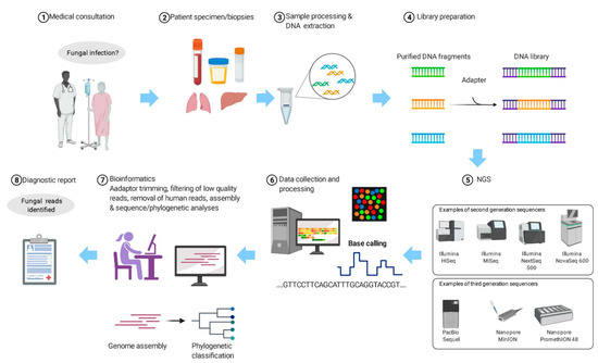 The exact procedures of sample processing depend on the NGS platform used. In a nutshell, DNA is extracted from the sample and a library is prepared (Figure 1). The library is then subject to NGS. The NGS platforms commonly used for microbiology diagnosis are Illumina’s MiSeq System, Life Technologies’ Ion Personal Genome Machine (PGM) System, BGI’s BGISEQ-50/500 (now upgraded and rebranded as MGI’s DNBSEQ-G50/G400) Systems and Oxford Nanopore Technologies MinION System. The sequencing data will be processed using software that trims the adaptor, filters the low-quality reads and removes the human reads. The processed sequences will be assembled if necessary and subject to robust bioinformatics analysis. The number of reads that match different fungal species and other microorganisms will be generated.