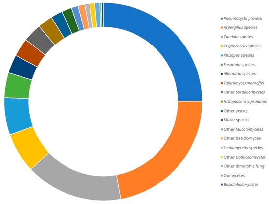 The first case of fungal infection diagnosed by NGS was reported in 2014. It was a case of allergic bronchopulmonary mycosis where A. fumigatus and Schizophyllum commune sequences were detected in the homogenised sputum and mucoid plugs of the patient [26]. Since then, up to the time of writing, a total of 319 cases of fungal infections diagnosed by NGS were described in the literature, with some in case reports and others in case series or cohorts [26,27,28,29,30,31,32,33,34,35,36,37,38,39,40,41,42,43,44,45,46,47,48,49,50,51,52,53,54,55,56,57,58,59,60,61,62,63,64,65,66,67,68,69,70,71,72,73,74,75,76,77]. In 40 out of the 319 cases (12.5%), more than 1 fungus was detected by NGS [26,27,28,32,34,39,41,44,45,53,59,62,64,67,73,74]. Pneumocystis jirovecii is the predominant fungus reported (~25% of the fungi detected), followed by Aspergillus species (~22%), Candida species (~16%), Cryptococcus species (~7%), Rhizopus species (~6%), Fusarium species (~4%), Alternaria species, Talaromyces marneffei and other Sordariomycetes (~3% each), Histoplasma capsulatum, other yeasts and Mucor species (~2% each), as well as some other rare fungal species (collectively ~5%) (Figure 2). Excluding P. jirovecii, which is generally unculturable, out of the remaining 274 fungi detected by NGS, only 105 (~38%) were recovered by fungal culture from the same or different specimens from the respective patients [26,29,30,31,32,33,34,35,36,37,38,39,43,45,46,49,52,54,57,59,62,64,66,67,71,73,76,77].