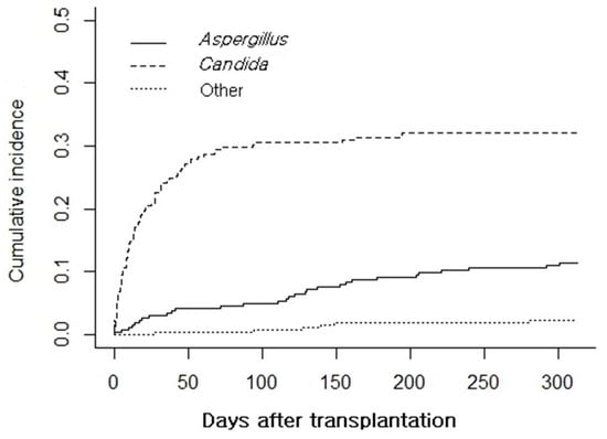 Candida spp. and Aspergillus spp. were cultured from 85 (35.1%) and 29 (12.0%) patient samples at a median of 31.5 and 111.4 days after LTx, respectively. The cumulative incidence rates stratified by genus are presented in Figure 2. The other fungal genera cultured were Rhizopus spp., Saccharomyces spp., Penicillium spp., and Blastochizomyces spp. FPRSs were predominant in the first 90 days and the overall cumulative incidence of Candida spp. was approximately three times higher than that of Aspergillus spp. In the setting of itraconazole administration for 6 months post-LTx, C. glabrata accounted for 36.5% of all Candida-positive respiratory samples, followed by C. albicans (21.2%) and C. tropicalis (11.8%) (Table 1). Thirteen of twenty-nine (44.8%) Aspergillus spp. cases involved A. fumigatus; in the other cases, the strains were not identified.