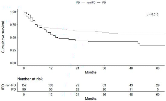The 1-year survival analysis did not indicate a statistical difference, although the IFD group had lower overall survival outcomes than the non-IFD group (log-rank p = 0.015, Figure 4). Among the 99 IFD cases, the treatment failure rate was 52.5% (52/99). The 1-year and overall mortality rates were 43.4% (43/99) and 58.6% (58/99) for the IFD group, respectively.
