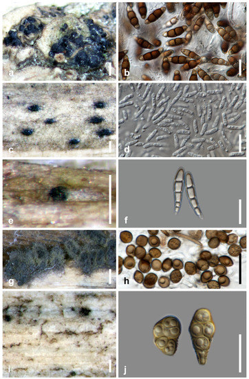 - Wanasinghe, D.N.; Hyde, K.D.; Jeewon, R.; Crous, P.W.; Wijayawardene, N.N.; Jones, E.B.G.; Bhat, D.J.; Phillips, A.J.L.; Groenewald, J.Z.; Dayarathne, M.C.; et al. Phylogenetic revision of Camarosporium (Pleosporineae, Dothideomycetes) and allied genera. Stud. Mycol. 2017, 87, 207–256. [Google Scholar] [CrossRef]