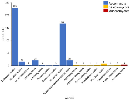 Salt marsh fungi are distributed into 17 classes (Table 1, Figure 5). Dothideomycetes has the highest number of taxa, which comprises 47.12% (229 taxa), followed by Sordariomycetes with 167 taxa (34.36%). Twenty-one species (in 20 genera) can be referred to as Ascomycota genera incertae sedis. The Ascomycetes with the least number of species include Leotiomycetes (21 species, 4.32%), Eurotiomycetes (16 species, 3.29%), Orbiliomycetes (3 species, 0.62%), Saccharomycetes (3 species, 0.62%), Lecanoromycetes (2 species, 0.41%), and Pezizomycetes (1 species, 0.21%).