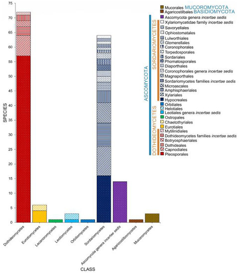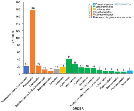 Salt marsh fungi recorded from different halophytes were distributed among 48 orders (Table 1, Figure 6). The Pleosporales is the largest order, with 178 taxa recorded followed by Hypocreales (41), Microascales (26), Capnodiales (22), Helotiales (18), Xylariales (17), Sordariales (16), Amphisphaeriales (15), and Eurotiales (13). The remaining 41 orders have less than 10 species (Table 1, Figure 5). Forty-two taxa belong to incertae sedis (Ascomycota genera incertae sedis: 21; Dothideomycetes families incertae sedis: 11; Sordariomycetes families incertae sedis: 9; Xylariomycetidae family incertae sedis: 1).