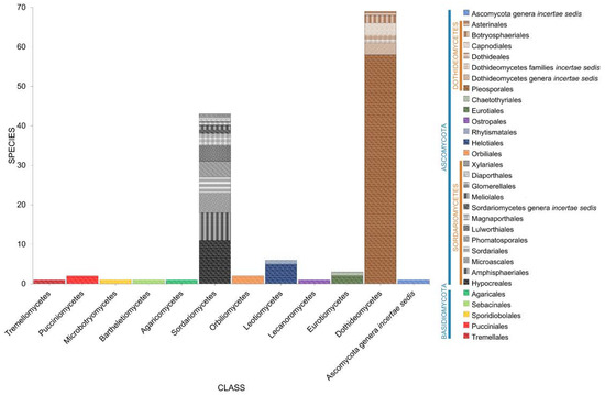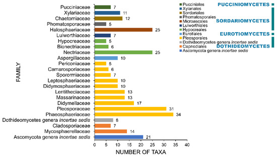 Sixty-seven taxa were recorded in Elymus pungens and belong to Ascomycota. Most of the taxa belong to Dothideomycetes (32 taxa), followed by Sordariomycetes (21 taxa), Leotiomycetes, and Eurotiomycetes (6 taxa) (Table 1, Figure 10).