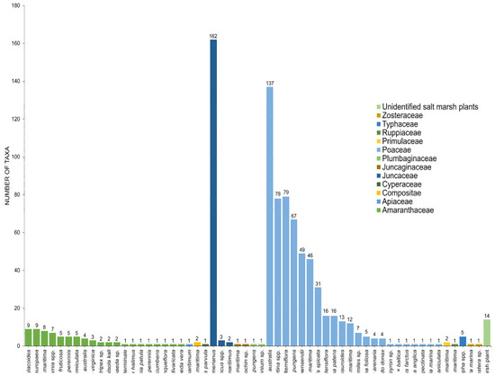The number of taxa observed from different hosts in salt marsh ecosystems.