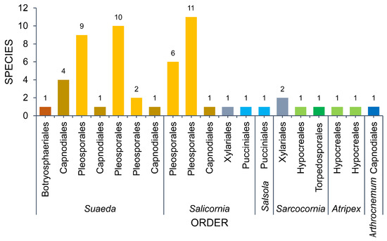 Fungi from Atriplex total 11 taxa (10 genera) and all of these belong to Pleosporales (Dothideomycetes). Sarcocornia harbors seven taxa (six Dothideomycetes, one Sordariomycetes). Only two taxa (Alternaria spp., Stemphylium spp.) and a single taxon (Mycosphaerella salicorniae) were reported from Salsola [35] and Arthrocnemum [35], respectively.
