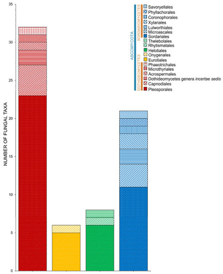 A total of 12 taxa (six Sordariomycetes; the following five Dothideomycetes: Micronectriella agropyri, Lautitia danica, Leptosphaeria pelagica, Septoriella vagans, Paradendryphiella salina; one Leotiomycetes: Thelebolus crustaceus) were recorded in Puccinellia maritima [38]. All the taxa from Sordariomycetes belong to Sordariales (Chaetomium elatum, C. globosum, C. thermophilum, Corynascus sepedonium, Thermothielavioides terrestris, Sordaria fimicola) [38].