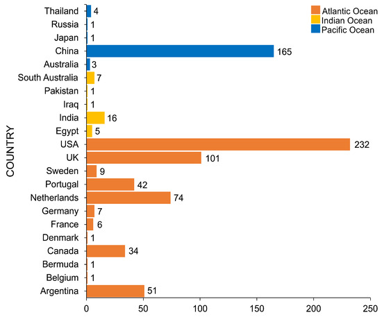 The salt marsh fungi reported are from countries of three major oceans, as documented in Figure 14. The Atlantic Ocean consists of 12 countries, wherein the USA had the highest number of species recorded (232 taxa) followed by the UK (101 taxa), the Netherlands (74 taxa), and Argentina (51 taxa). China had the highest number of salt marsh fungi in the Pacific Ocean with 165 taxa reported, while in the Indian Ocean, India reported the highest taxa (16 taxa). Most of the biodiversity studies documenting salt marsh fungi in the Atlantic Ocean are mostly from the USA and the UK and this reflects the high number of taxa [32,36,38,49,61]. China ranked second with the most number of salt marsh fungal taxa, mainly due to the biodiversity study in Phragmites australis conducted by Poon et al. [41].