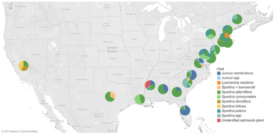 Map of the United States of America (USA) showing the distribution of fungal diversity studies of halophytes in different states. The different color of each pie chart represents the hosts, and the angle measured the number of their fungal associates.