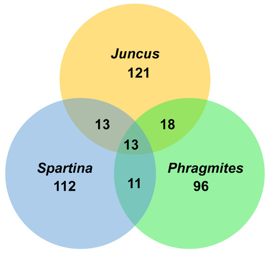 Venn diagram showing the association of salt marsh fungi from commonly studied halophytes.