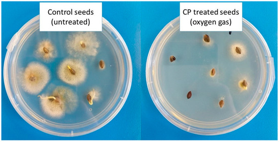 Apart from beneficial action on seed germination and plant growth and development, one of the outstanding effects of plasma treatment is the sterilization of the seed surface [6,70,71]. Free radicals and reactive oxygen species generated by CP induce bactericidal and fungicidal effects, increasing the overall benefit of the CP technology [39]. The use of CP as a sterilizing agent is an alternative to conventional sterilization methods involving various fungicides, being safe both for the operator and the subjects exposed to the plasma, if the operating conditions and set up is optimal, and environmentally friendly [72]. Moreover, CP treatment can also be used to remove harmful chemicals such as fungicides and other pesticides from the surface of long-stored seeds [64]. However, if seeds are intended for further sowing (preharvest CP treatment), their germination parameters must stay unimpaired.