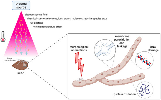 Most studies conducted to date have focused on the microbial inactivation or sterilization efficiency of CP on different bacterial species. However, to assess the efficiency of plasma sterilization, the most resistant microorganisms should be tested [72]. Bacterial endospores and fungi with thick cell walls seem to be the object of interest. It is essential that all possible biological effects that can be caused by plasma are studied in detail and well characterized before CP is accepted as an alternative approach to conventional sterilization methods [26]. It is important to optimize the decontamination process to successfully achieve the elimination of the target microorganisms [5]. We have already mentioned that fungal contamination of stored seeds and cereals is considered an important safety issue, therefore, it is crucial to suppress fungal growth. CP technology offers a promising solution for inhibition of fungal growth (Figure 2), as discussed in the following section.