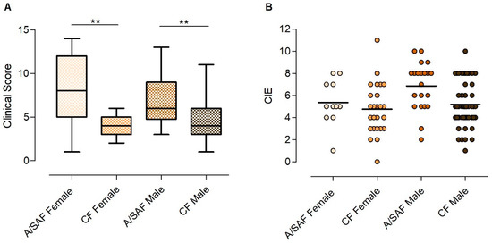 (A) Clinical score of the paracoccidioidomycosis patients on admission, according to the clinical form and gender (acute/subacute form (A/SAF) and chronic form (CF)). Medians, interquartile ranges, and min./max. ** p < 0.01. (B) Quantitation of anti-Paracoccidioides brasiliensis antibody titers by counterimmunoelectrophoresis (CIE) in the serum of paracoccidioidomycosis patients on admission, according to the clinical form and gender. Each dot represents a patient; the lines denote medians.