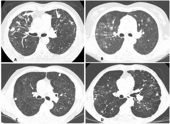 The most common alterations found on women’s pulmonary HRCT taken before treatment. (A) Upper lobes showing nodules. (B) Upper lobes showing ground-glass opacities. (C) Lower lobes showing micronodules (some indicated by arrows). (D) Diffuse emphysema and architectural distortion.