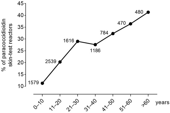 Percentage of paracoccidioidin skin test reactors gathered from references 18, 19, 21–25, 27, 28, 30, 32, 35, 36, 39–41, 44, and 47. The total number of persons tested for each age interval is indicated.