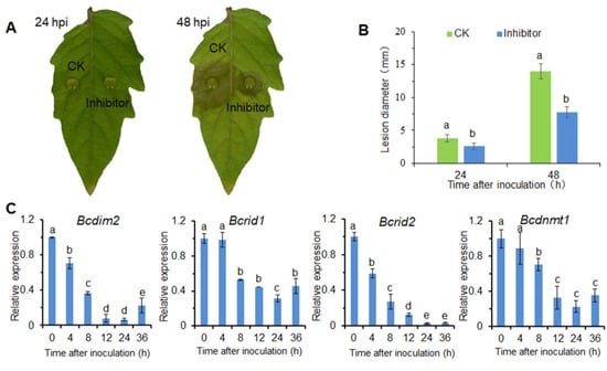 In order to determine whether DNA methylation was involved in the infection process of B. cinerea, we treated conidia with 5-azacytidine (5-Aza), a DNA methylation inhibitor, and then measured the virulence on detected tomato leaves. The results showed that DNA methylation inhibitor 5-Aza significantly decreased the virulence of B. cinerea on tomato leaf (Figure 1A). After 48 h of inoculation, the lesion diameter of the inhibitor-treated group was decreased by 45% compared to the CK group (Figure 1B).