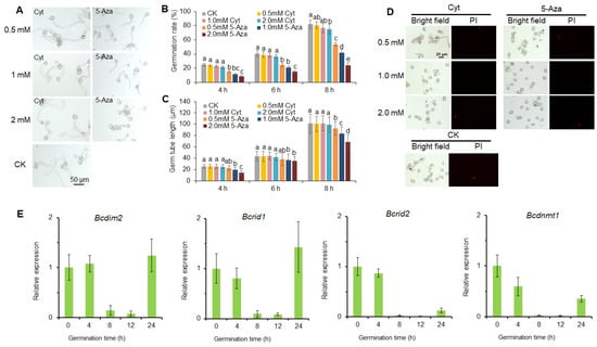DNA methylation is involved in the development of B. cinerea. (A) The effect of 5-azacytidine on conidial germination of B. cinerea. The conidia of B. cinerea were incubated in potato dextrose broth (PDB) medium containing 0.5, 1, and 2 mm 5-azacytidine (5-Aza). Cytidine-treated (Cyt) conidia were used as negative control, and the untreated conidia were used as blank control (CK). (B) Conidial germination rate of B. cinerea after treating with 5-Aza and Cyt. (C) Germ tube length of B. cinerea after treating with 5-Aza and Cyt. (D) Cytotoxicity test of 5-azacytidine on B. cinerea. The conidia were stained with propidium iodide (PI) after treating with 5-azacytinde (5-Aza). Cytidine (Cyt) was used as negative control, and the untreated conidia were used as CK. (E) Relative expression of DNA methyltransferase genes during conidial germination of B. cinerea. Vertical bars represent standard errors of the means. Columns with different letters indicate significant differences (p < 0.05).