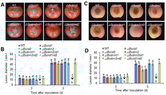 Virulence assay of DNA MTase mutants on fruit hosts. (A) Disease symptoms on tomato fruits 5 d after inoculation. (B) Lesion diameters on tomato fruits. (C) Disease symptoms on apple fruits 5 d after inoculation. (D) Lesion diameters on apple fruits. Vertical bars represent standard errors of the means. Columns with different letters indicate significant differences (p < 0.05).