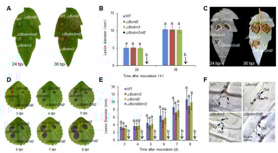 Verification of the synergistic effect of Bcdim2 and Bcrid2 on leaf hosts. (A) Disease symptoms on detached tomato leaves. (B) Lesion diameters on detached tomato leaves. (C) Detection of ROS accumulation around the infectious sites of tomato leaves after inoculation. The infected tomato leaves were stained by DAB after 24 and 36 h of inoculation. (D) Disease symptoms on detached strawberry leaves. (E) Lesion diameters on detached strawberry leaves. (F) Onion epidermis penetration assay. The onion epidermises were stained by cotton blue after 16 h of inoculation. In: the hyphae infected into the onion epidermis cells (brown color); Out: the hyphae outside the onion epidermis cells (blue color); Ap: appressoria. Vertical bars represent standard errors of the means. Columns with different letters indicate significant differences (p < 0.05).