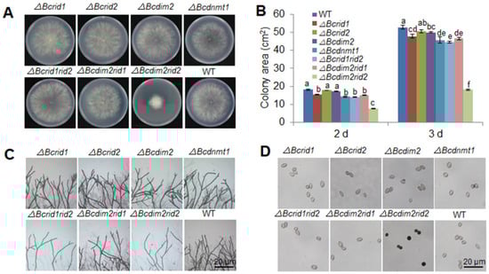 The vegetative growths of four single knockout mutants were not obviously affected (Figure 5A,B). The growth rate of ΔBcdim2rid2 was severely inhibited (Figure 5A,B), and ΔBcdim2rid2 showed more sparse hyphae density at the colony edge on PDA plates (Figure 5C). The color of ΔBcdim2rid2 conidia was black under microscopic examination (Figure 5D). The conidiation of ΔBcdim2rid2 was significantly decreased (Figure 5E). In addition, the germination rate and tube length of ΔBcdim2rid2 spores showed to be significantly lower as compared to that of wild-type (Figure 5F,G). These results suggested that Bcdim2 and Bcrid2 were involved in the development of B. cinerea, Bcdim2, and Bcrid2 act in concert with each other.
