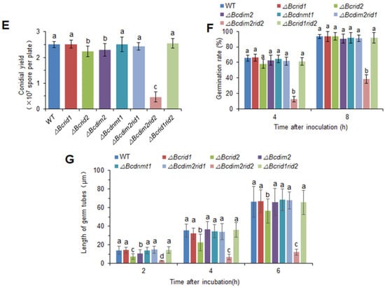 DNA MTases affect the vegetative growth and conidiation of B. cinerea. (A) Colony morphology of wild-type and mutants after culturing for 4 d on PDA plates. (B) Statistical analysis of radial growth of wild-type and mutants. (C) Mycelial morphology of wild-type and mutants. (D) Conidial morphology of wild-type and mutants. (E) Conidial yield of wild-type and mutants after culturing for 14 d. (F) Statistical analysis of the germination rates of wild-type and mutants. Vertical bars represent standard errors of the means. (G) The tube length of different mutants at 2 h, 4 h, and 6 h after inoculation. Columns with different letters indicate significant differences (p < 0.05).