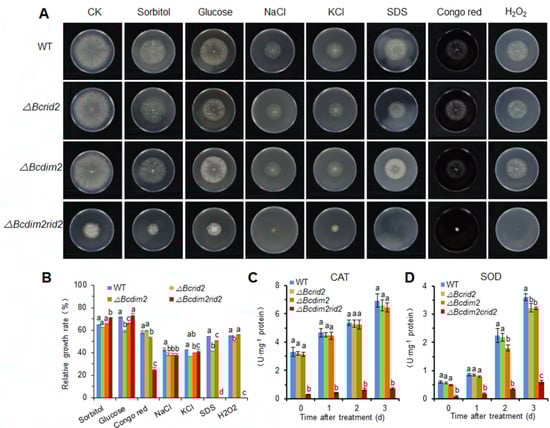 The oxidative tolerance of ΔBcdim2rid2 is significantly decreased. (A) Tolerance test of wild-type and mutants to osmotic stress (1 M sorbitol, 1 M glucose, 1 M NaCl, and 1 M KCl), cell wall stress (2 mg/mL Congo red, 0.02% SDS), and oxidative stress (10 mm H2O2). (B) Relative growth rates of wild-type and mutants under different stressors. (C) The activities of catalase (CAT) in wild-type and mutants. (D) The activities of superoxide dismutase (SOD) in wild-type and mutants. Vertical bars represent standard errors of the means. Columns with different letters indicate significant differences (p < 0.05).