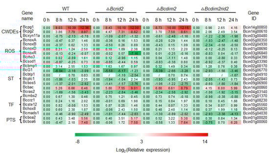 The pathogenic genes are suppressed during the interaction between ΔBcdim2rid2 and host. CWDE: cell wall degrading enzyme gene; ROS: ROS metabolism related gene; ST: signal transduction component; TF: transcriptional factor; PTS: phytotoxin synthesis gene.