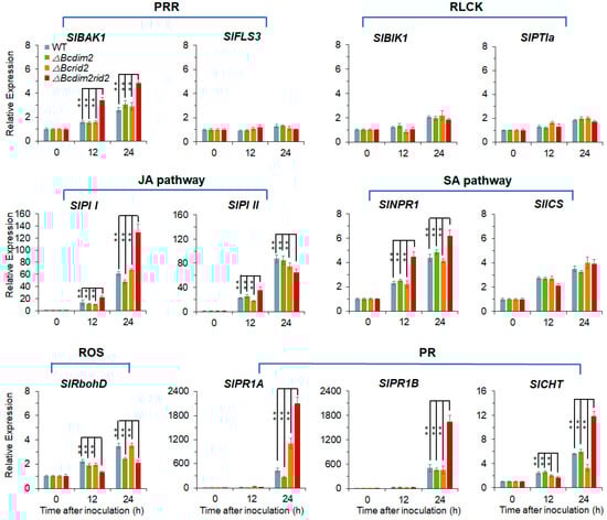 The expression of resistant genes in fruit is induced by ΔBcdim2rid2. PRR: pattern recognition receptors (or coreceptor); RLCK: receptor-like cytoplasmic kinases; JA pathway: jasmonic acid pathway components; SA pathway: salicylic acid pathway components; ROS: NADPH oxidase; PR: pathogenesis-related genes. Asterisks indicate significant differences between ΔBcdim2rid2 and other strains (** p < 0.01).
