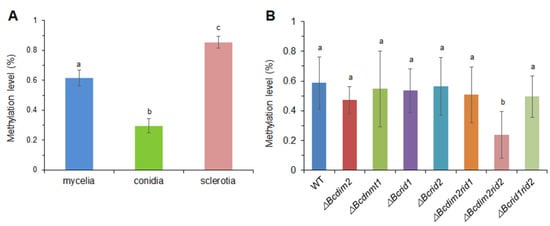 The methylation levels in different tissues and different strains of B. cinerea. (A) The global methylation levels in different tissues of B. cinerea. (B) The global methylation levels in wild-type and mutants. A total of 100 ng DNA of each strain was added and fixed on a strip well with a specific affinity for DNA. DNA methylation level was quantified by a 5mC capture antibody and a detection antibody. The amount of methylated DNA was proportional to the optical density (OD) values obtained from the enzyme-linked immunosorbent assays and is presented according to the calculated percentage of 5mC. Columns with different letters indicate significant differences (p < 0.05).