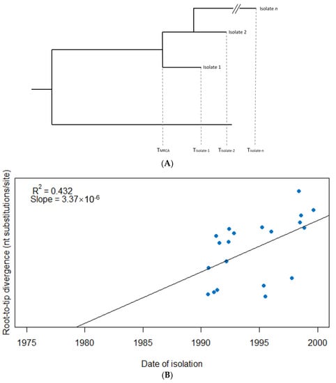 - Rambaut, A.; Lam, T.T.; Carvalho, L.M.; Pybus, O. Exploring the temporal structure of heterochronous sequences using TempEst (formerly Path-O-Gen). Virus Evol. 2016, 2, vew007. [Google Scholar] [CrossRef]