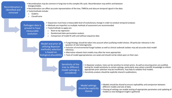 - Consider the biology of the organism and potential rate heterogeneity in the selection of appropriate clock models, particularly if datasets are limited to just clinical outbreak isolates or if common ancestors are far back in time. Tests of model fit between different clock (and demographic) models can have poor performance and should not be solely relied upon [108]. Since most fungal infections are saprophytic, stemming from the environment, inclusion of environmental fungal isolates in a phylogeny may provide better indication of heterogeneity in clock rates. Further research into fungal states of hypermutation and quiescence may shed more light on these variations and how frequent or infrequent they may be.