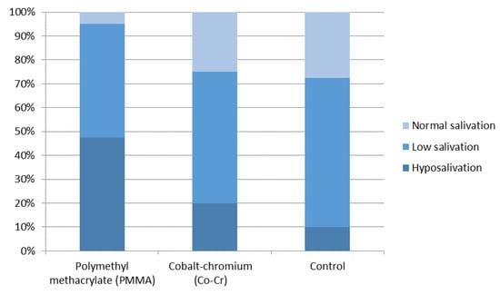 The distribution of salivary flow rate in subjects with PMMA removable denture wearers, Cr–Co framework denture wearers, and the control subjects is shown in Figure 1. Differences between the tested groups are statistically significant. The salivary flow rate is lowest in the PMMA group and is statistically different from both the Co–Cr and the control groups levels (p < 0.001).