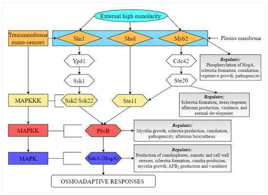 Illustration of the HOG-MAPK signaling pathway in A. flavus. PbsB integrates signals from two major independent upstream osmosensing mechanisms, which leads to the activation of specific MAPKKKs. Under osmostress, activated PbsB activates the SakA (HogA) MAPK, which induces a set of osmoadaptive responses.