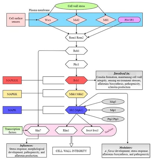 Illustration of the Slt2-MAPK signaling pathway in A. flavus. Signals are initiated at the plasma membrane (PM) through the cell-surface sensors Wscs, Mid2, and Mtl1. The extracellular domains of these proteins are highly O-mannosylated. Together with PI4, 5P2, which recruits the Rom1/Rom2 guanine nucleotide exchange factors (GEFs) to the plasma membrane, the sensors stimulate nucleotide exchange on Rho1. Two transcription factors, Rlm1 and SBF (Swi4/Swi6), are activated by the pathway. Skn7 may also contribute to the cell wall integrity transcriptional program.